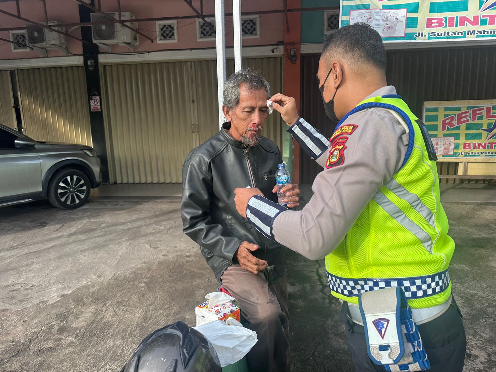 Bripka Indias secara cepat memberikan pertolongan dengan mengobati luka yang dialami oleh bapak tersebut. Respons yang tanggap dan peduli dari anggota Satuan Lalu Lintas Polres Muara Enim terhadap kondisi darurat di jalan raya.