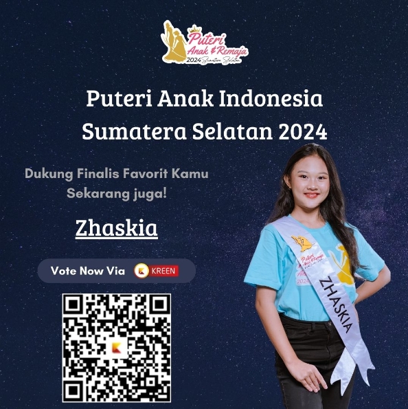 Mohon doanya dari masyarakat Kabupaten Muara Enim untuk dapat memberikan support dan dukungan agar Zhaskia ini dapat melaju ke tahapan berikutnya pada event pemilihan Putri Anak Indonesia 2024 sebagai Duta Sumsel.