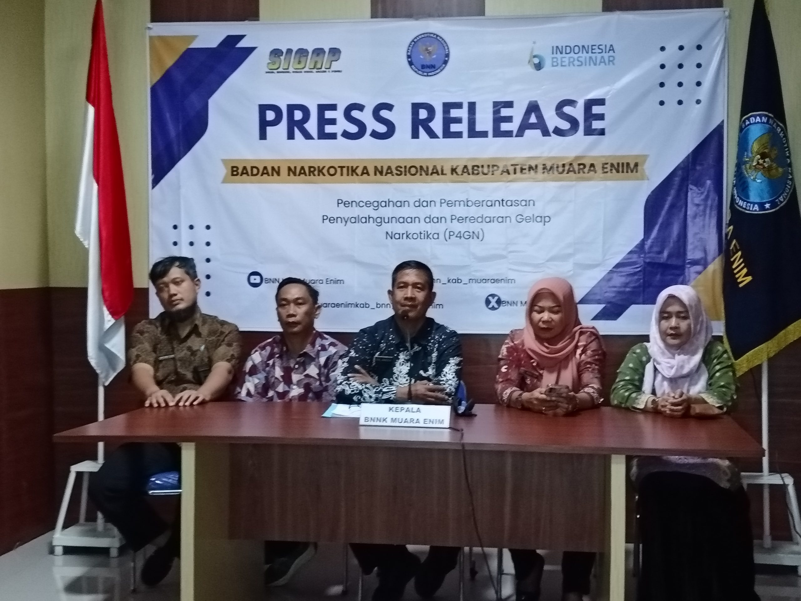 Hal ini kemukakan Kepala BNN Kabupaten Muara Enim, AKBP Erlangga, S.E., M.H bersama Kasubbag Umum, Arni Zulifah Matrianingsih, S.E berserta seksi P2M, Seksi Pemberantasan Dan Seksi Rehabilitasi BNNK Muara Enim dalam acara Press Release BNN Kabupaten Muara Enim 2024, pada Selasa (24/12/2024).