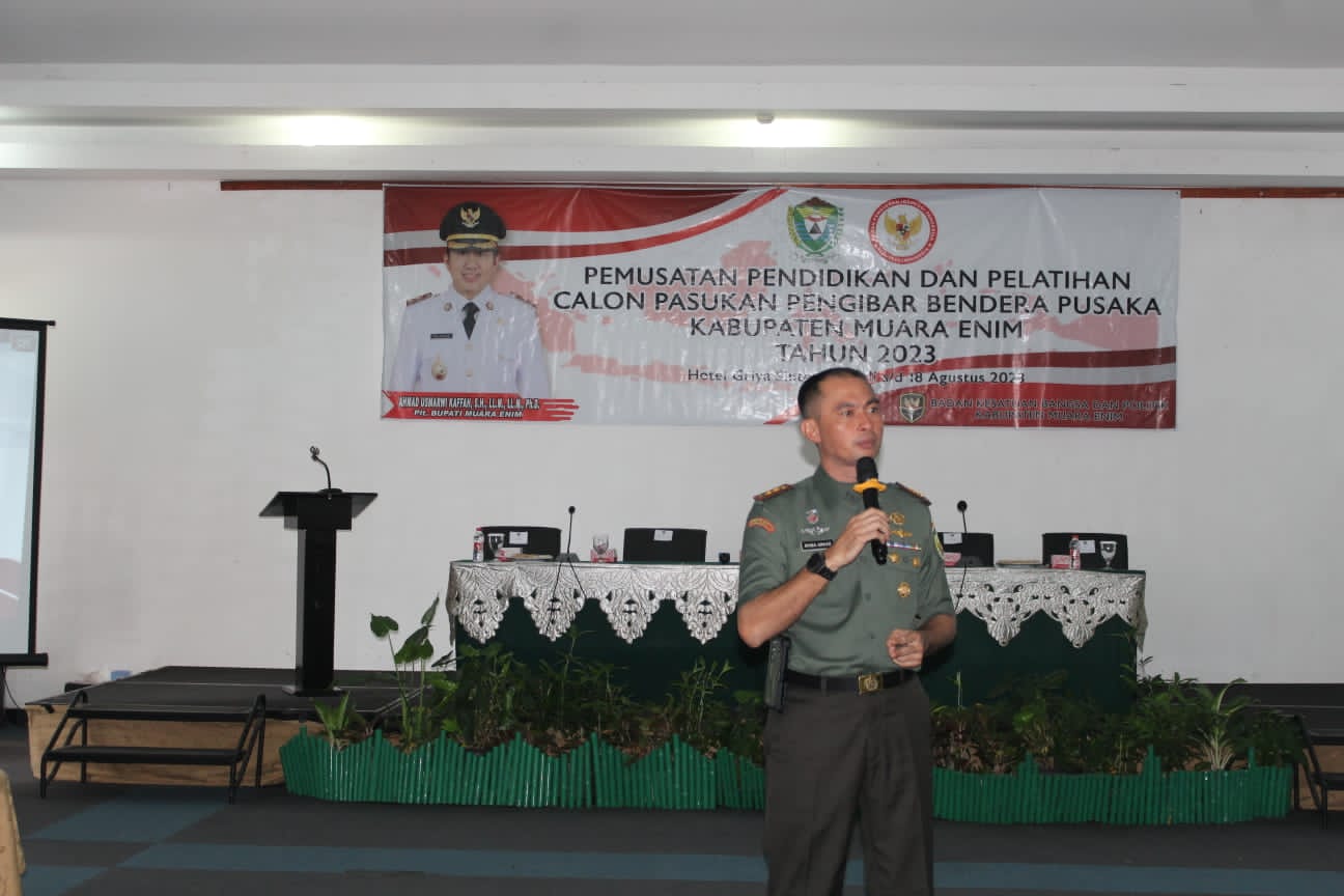 Sumsel hari ini.id – Dalam rangka memberikan pengatahuan dan wawasaan kebangsaan bela negara yang luas Komandan Kodim 0404 Muara Enim Letkol Arh Rimba Anwar berikan meteri pelatihan bela negara pada peserta pembukaan Kegiatan Pemusatan Pelatihan Calon Pasukan Pengibar Bendera Pusaka (Capaska) Tingkat Kabupaten Muara Enim Tahun 2023 di Hotel Griya Sintesa Muara Enim. Selasa, (1/8/2023).