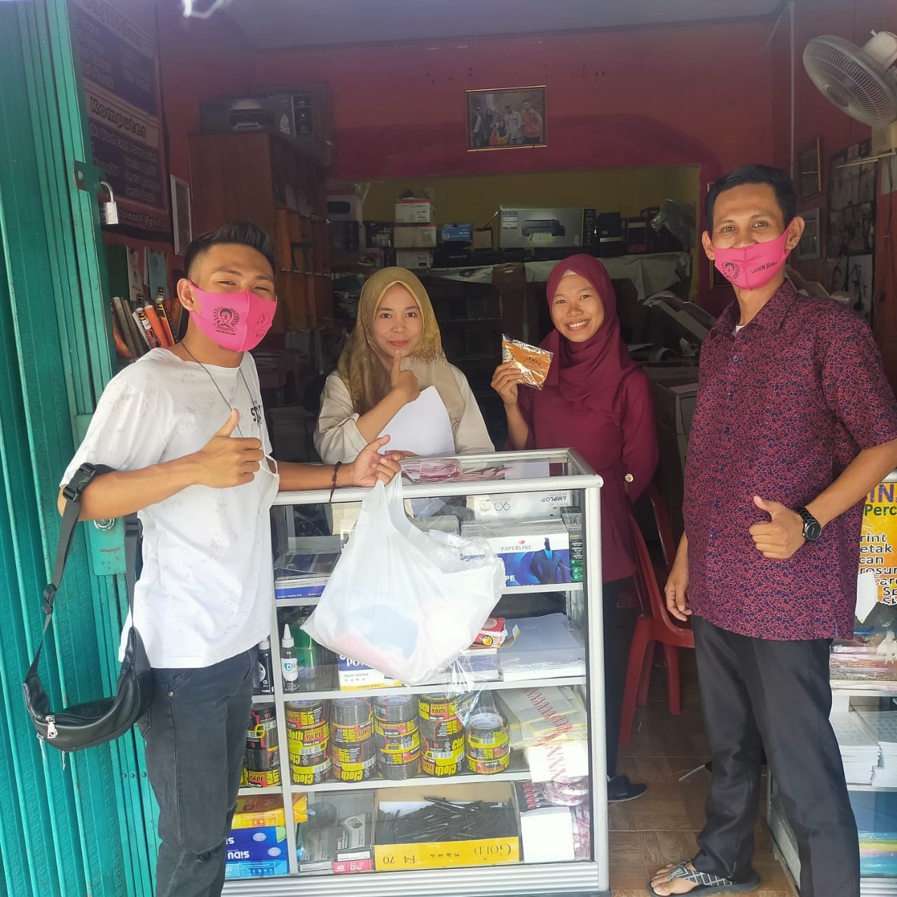 Anggota dan pengurus PUMA, membagikan satu persatu masker yang mereka bawa kepada pengemudi ojek, toko toko diseputaran pasar serta pejalan kaki yang melintas. Ada sekitar 200 lembar masker yang dibagikan ke masyarakat.