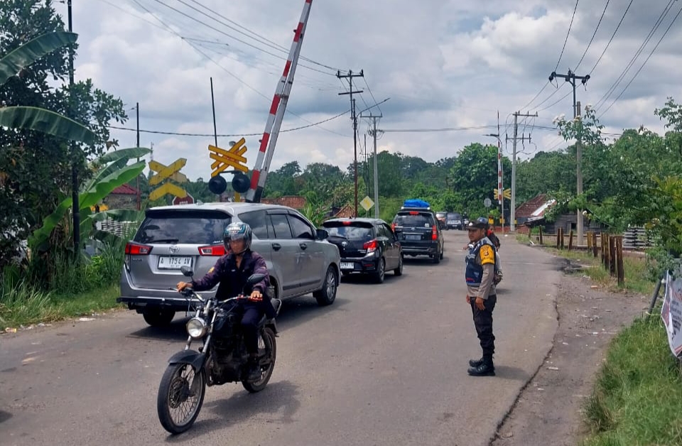 Pos pelayanan memberikan himbauan kepada pengguna jalan untuk selalu patuh pada rambu-rambu lalu lintas, tidak kebut-kebutan, dan tidak saling mendahului di perlintasan sebidang rel kereta api, Senin (15/4/24)
