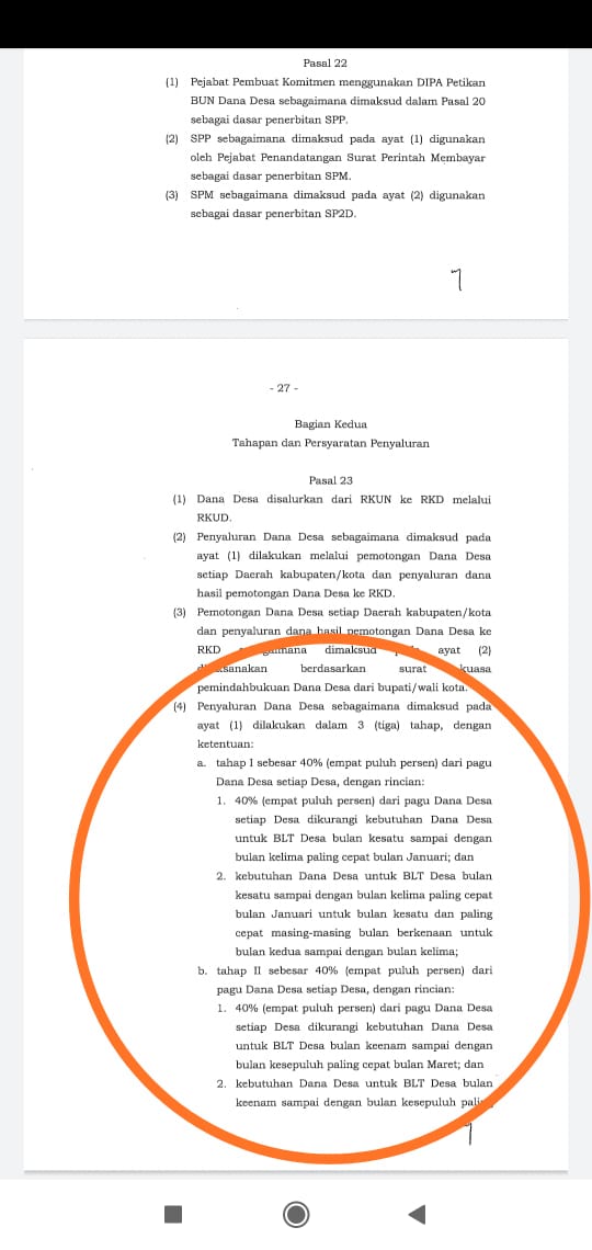 “Jadi, didalam pencairan tahap I sebesar 40 persen itu, didalamnya ada lagi aturan yang mengatur tahapan lagi untuk pencairan. Tidak seperti sebelumnya langsung 40 persen cair,” ungkap salah seorang kades yang enggan namanya disebut, pada Selasa (20/4/2021).