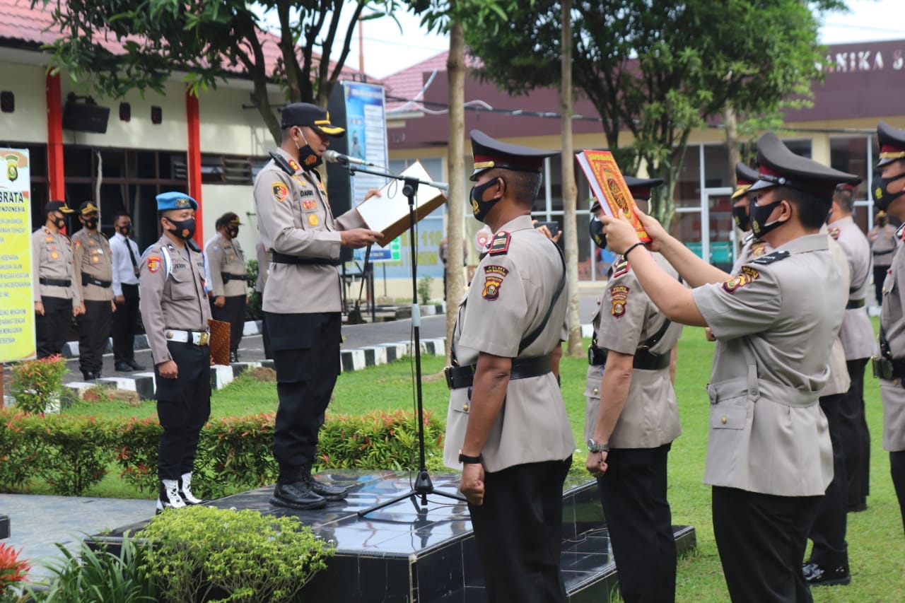 SHI.ID | MUARA ENIM – Kapolres Muara Enim AKBP Danny Sianipar S.I.K memimpin upacara sartijab Kabag Sumda, Kapolsek Lawang Kidul, Kapolsek Lembak, Kapolsek Rambang dan Sungai Rotan di lapangan Apel Polres Muara Enim, Senin (11/01/2021).