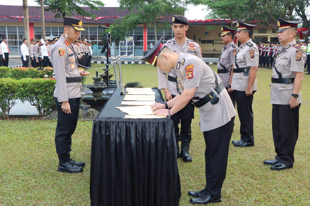 Kapolres juga mengucapkan terima kasih kepada pejabat yang akan bertugas ditempat yang baru atas kinerja yang telah diberikan selama bertugas di Polres Muara Enim.