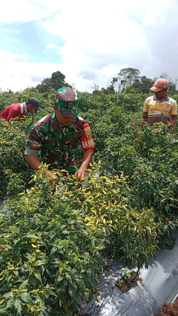 anggota Koramil 404-06/Semendo Kopda Hikmat melaksanakan giat komunikasi sosial bersama masyarakat desa binaan petani holtikultura jenis cabai di desa Tanjung raya.
