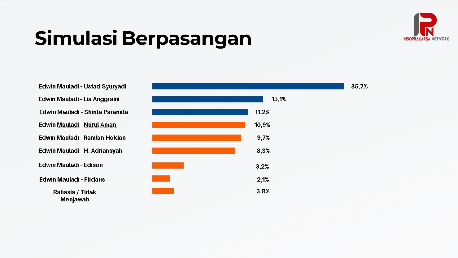 Dalam simulasi pasangan, tiga besar yang paling diminati adalah pasangan Edwin Mauladi – Ustad Syuryadi (35,7 persen), Edwin Mauladi – Lia Anggraini (15,1 persen), dan Edwin Mauladi – Shinta Paramita (11,2 persen).