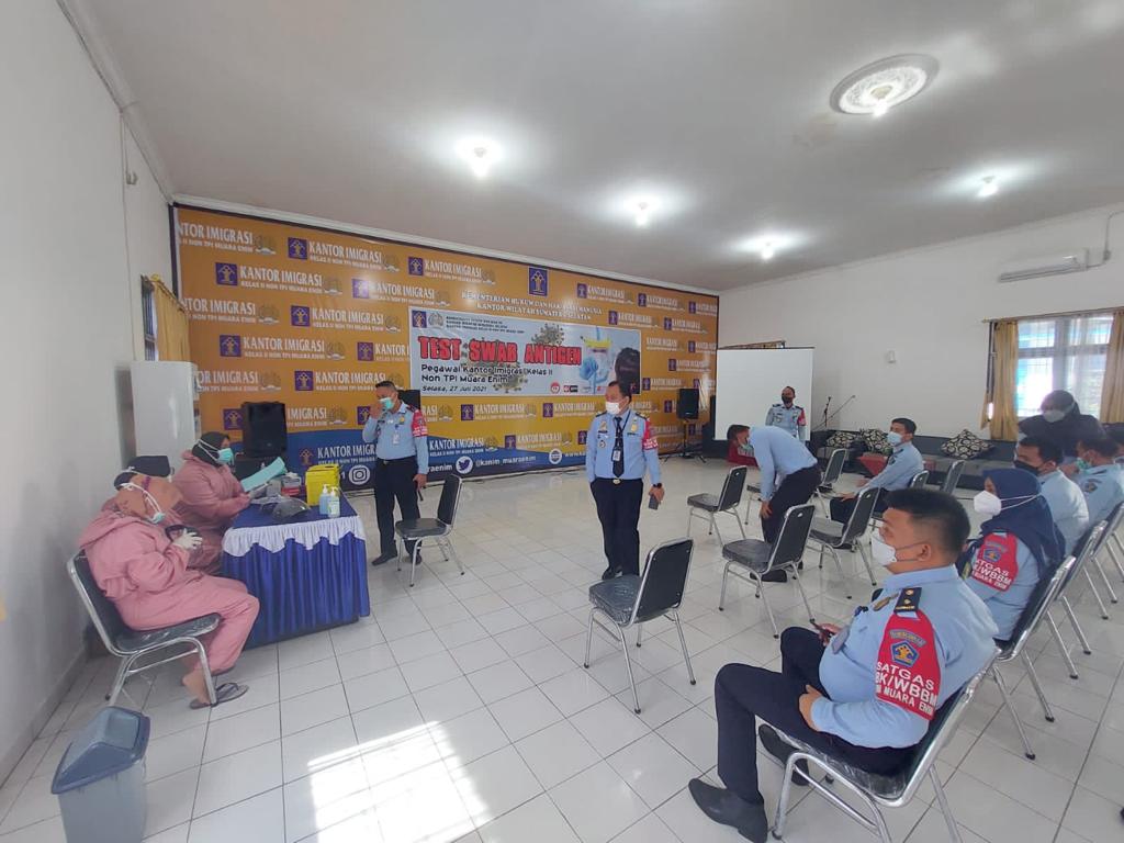 ” Ya, hari ini kami kembali melakukan Test Swab Antigen kepada seluruh pegawai ASN dan PPNPN Kantor Imigrasi kelas ll Non TPI Muara Enim, dalam rangka mengantisipasi pencegahan penyebaran Covid-19 bagi petugas pelayanan publik di kantor Imigrasi Muaraenim ,” Ujar Made Nur Hepi Juniartha SH MAP Kepala Imigrasi Kelas ll Non TPI Muaraenim kepada media ini.