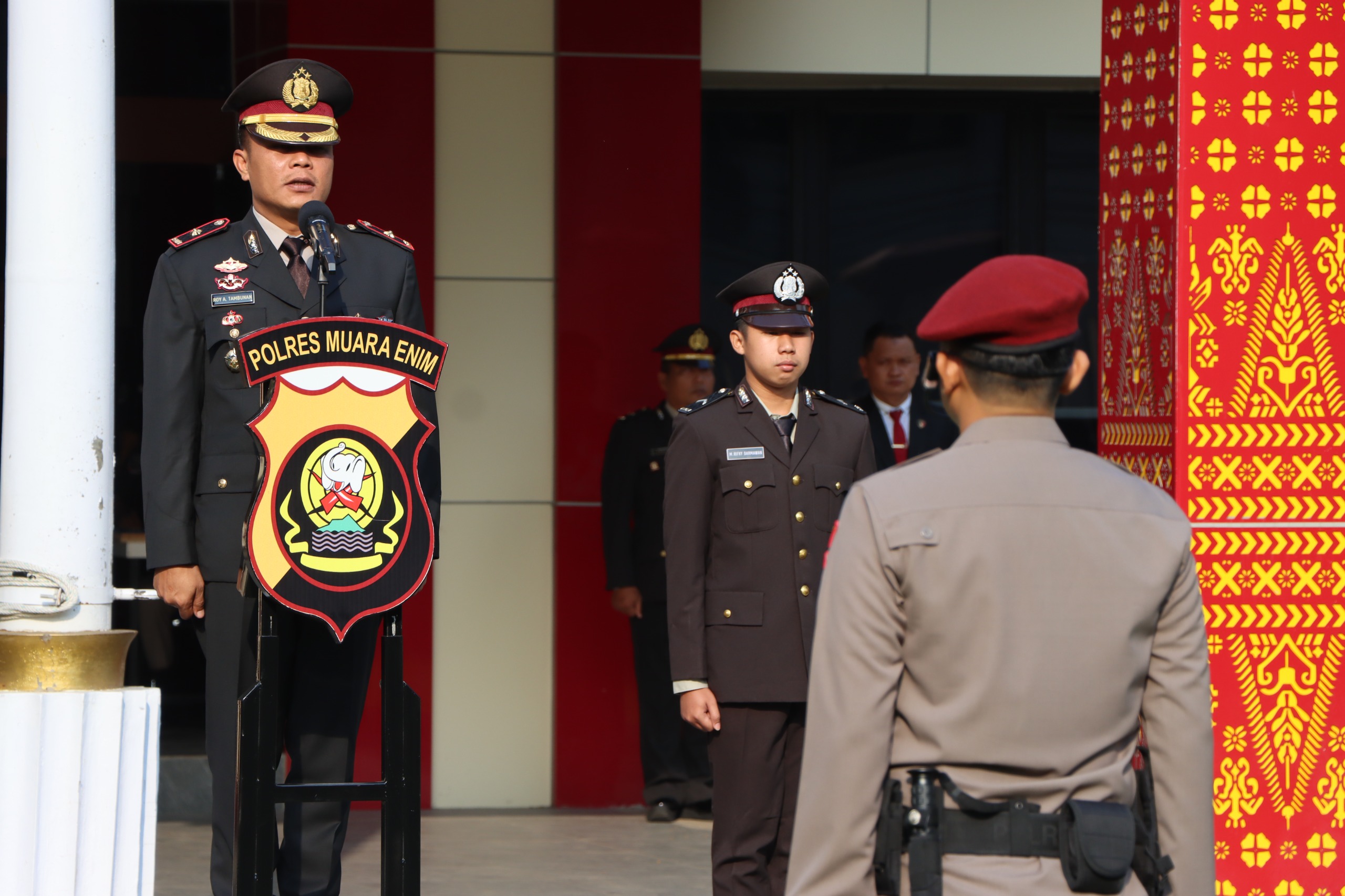 Wakapolres Muara Enim, Kompol Roy Arpian Tambunan, SP, SIK, bertindak sebagai Inspektur Upacara, mewakili Kapolres Muara Enim AKBP Jhoni Eka Putra, SH, SIK, MSi. Perwira Upacara dipercayakan kepada AKP Halim Kesumo, SH, MSi, sedangkan Komandan Upacara adalah Ipda Hari Saliansyah, SE. Upacara berjalan dengan khidmat dengan Bripka Yana Dwita sebagai pembawa acara, Aiptu Firmansyah, SH sebagai pembaca UUD 1945, dan Ipda Subagio yang membacakan Teks Keputusan Kongres Pemuda 1928.