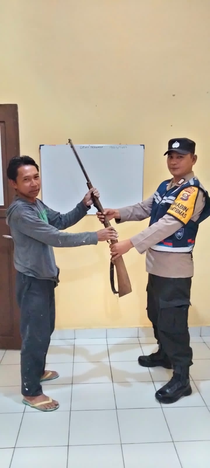 Kapolres PALI AKBP Khairu Nasrudin, S.I.K, M.H melalui Kapolsek Penukal Utara IPTU Arzuan, SH, bersama Bhabinkamtibmas Bripka Fitriawan menerima Serahan Senjata Api Rakitan (Senpira) Laras Panjang Jenis Kecepek dari masyarakat sebanyak 1 (Satu) pucuk.