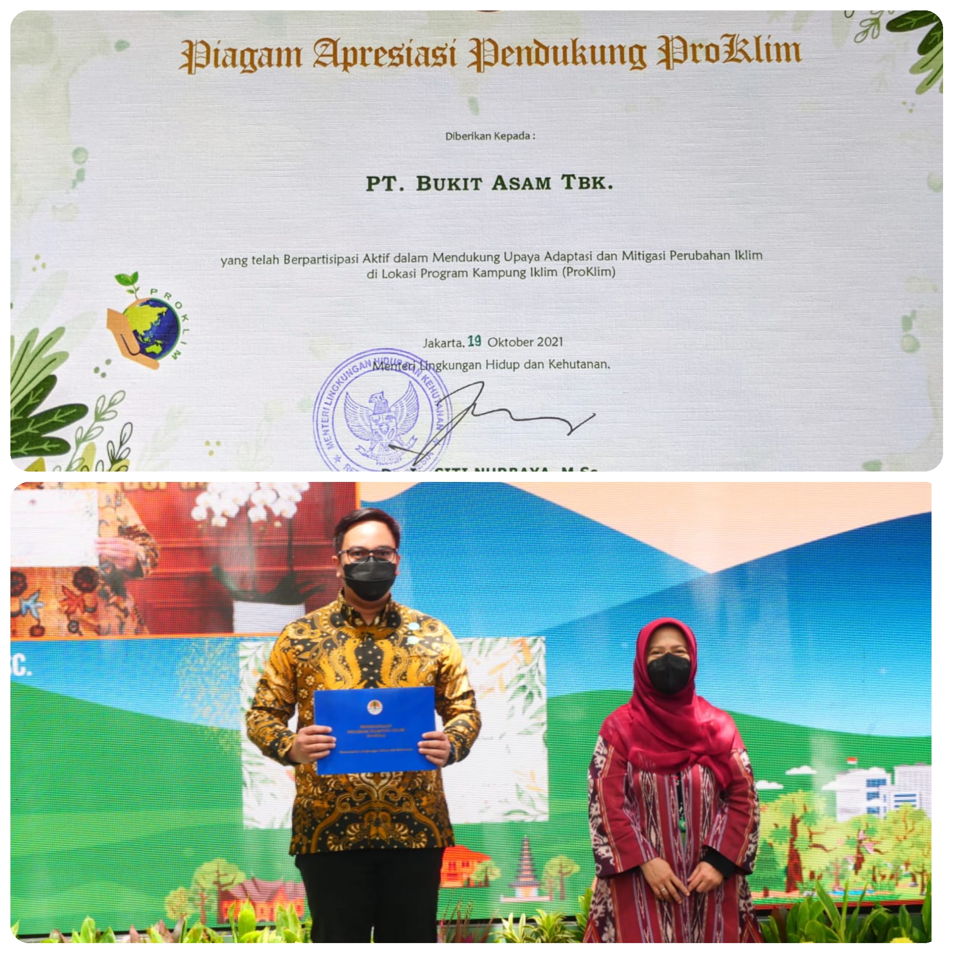 PTBA meraih sertifikat penghargaan Program Kampung Iklim (Proklim) 2021 yang acaranya diselenggarakan secara hybrid oleh KLHK, pada Selasa, 19 Oktober 2021.
