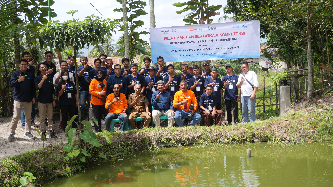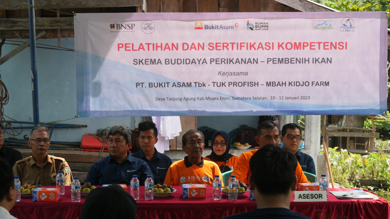 SHI.ID|MUARA ENIM – PT Bukit Asam Tbk (PTBA) bekerja sama dengan Rumah BUMN Bukit Asam, TUK PROFISH, Mbah Kidjo Farm mengadakan pelatihan dan sertifikasi kompetensi skema budidaya perikanan-pembemih ikan.
