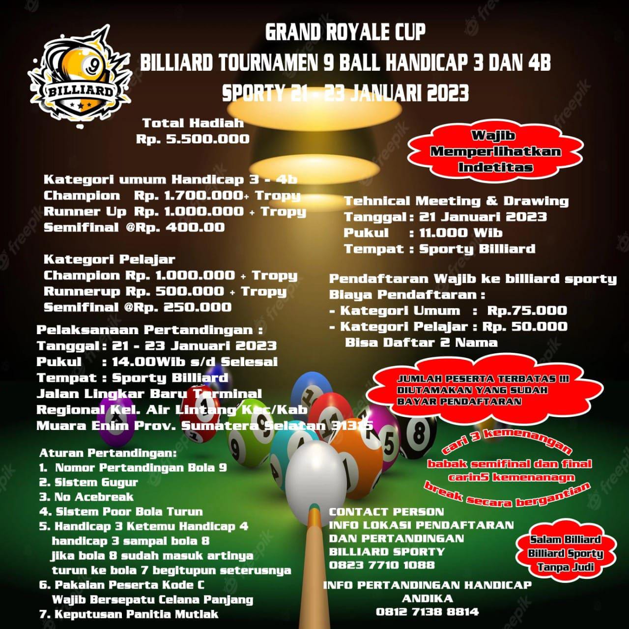Pada laga awal Turnamen Biliar Bola 9 di Sporty Biliar,masuk Delapan besar di tingkat pelajar yaitu Zio,Intan,Akil,Tias,Alif,Rafli dan Flora.sedangkan di tingkat Umum yang masuk Delapan Besar yaitu,Bram,Supri,Jefri,Yoga, Deny,Roby dan Deo.dannyang mana selanjutnya masing masing Peserta yang masuk Delapan besar tersebut akan kembali bertanding, pada Senin (23/1/2023) guna memperebutkan juara.(*)