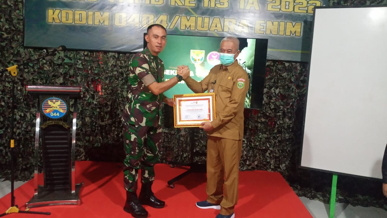 SHI.ID|MUARA ENIM – Dalam rangkaian TNI Manunggal Membangun Desa (TMMD) ke-113 yang di selenggarakan Kodim 0404 Muara Enim. Secara simbolis Kodim 0404 Muara Enim terima penghargaan juara 1 dari Badan Keluarga Berencana Nasional (BKBN) Provinsi Sumsel karena telah berhasil berprestasi dalam peran aktif terhadap gerakan kontrasepsi di tiga wilayah kerjanya.