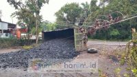 Truk Batu Bara Betonase Berat Terbalik, Timpa Kabel Listrik