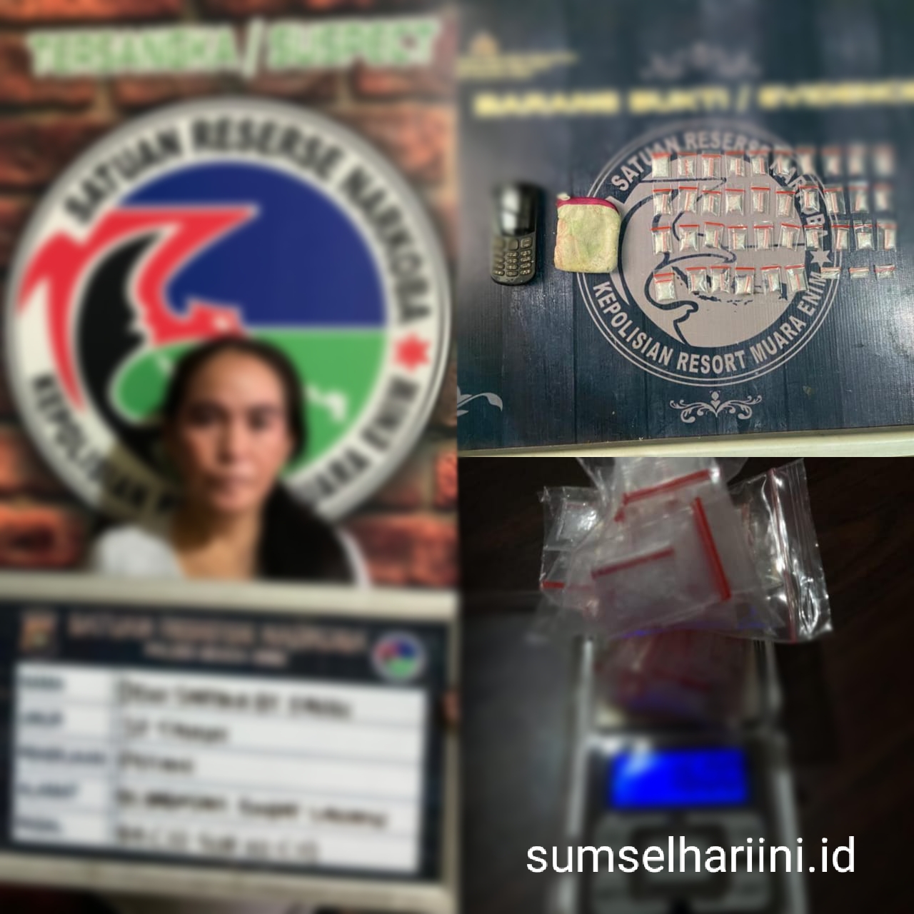 Ia diamankan oleh Sat Res Narkoba Polres Muara Enim berdasarkan informasi yang didapat, bahwa pelaku sering melakukan transaksi Narkoba. Dari penangkapan tersangka ini polisi berhasil mengamankan 39 paket yang diduga narkotika jenis sabu.