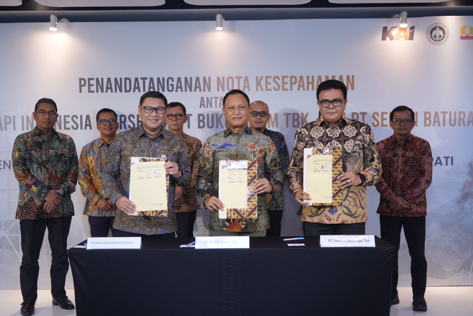 Penandatanganan MoU dilakukan oleh Rafli Yandra, Direktur Pengembangan Usaha PT Bukit Asam Tbk (PTBA); Rudi As Aturridha, Direktur Pengembangan Usaha & Kelembagaan PT Kereta Api Indonesia (Persero); Muhammad Syafitri, Direktur Operasi PT Semen Baturaja Tbk (SMBR) di Signature Lounge SIG, Jakarta, Selasa (22/10/2024).