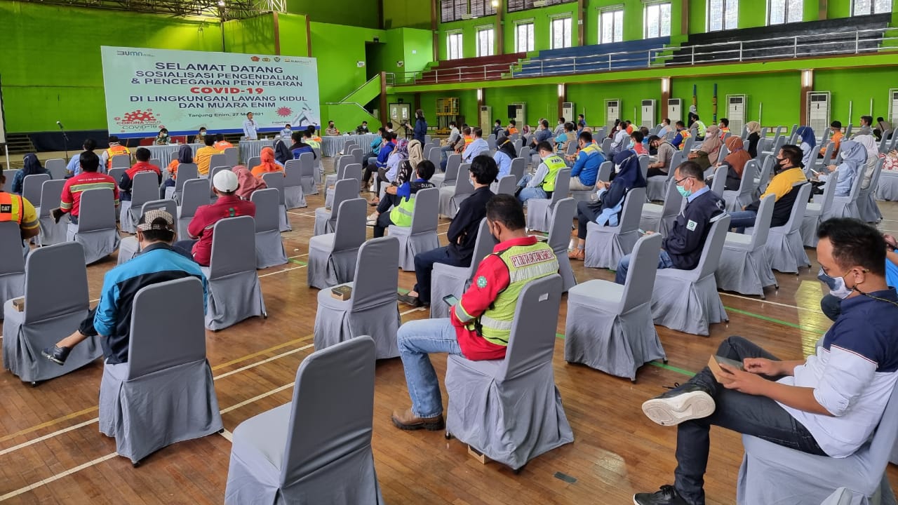 SHI.id|Muara Enim – Sedikitnya ada 91 peserta yang terdiri dari Vendor dan Kontraktor PT Bukit Asam (PTBA), mengikuti sosialisasi Pengendalian dan Pencegahan Covid-19 di Lingkungan Kecamatan Lawang Kidul, Kabupaten Muara Enim, Provinsi Sumsel. Kegiatan ini dihelat di Gedung Olahraga (GOR) Bukit Asam, pada Kamis (27/5/2021).