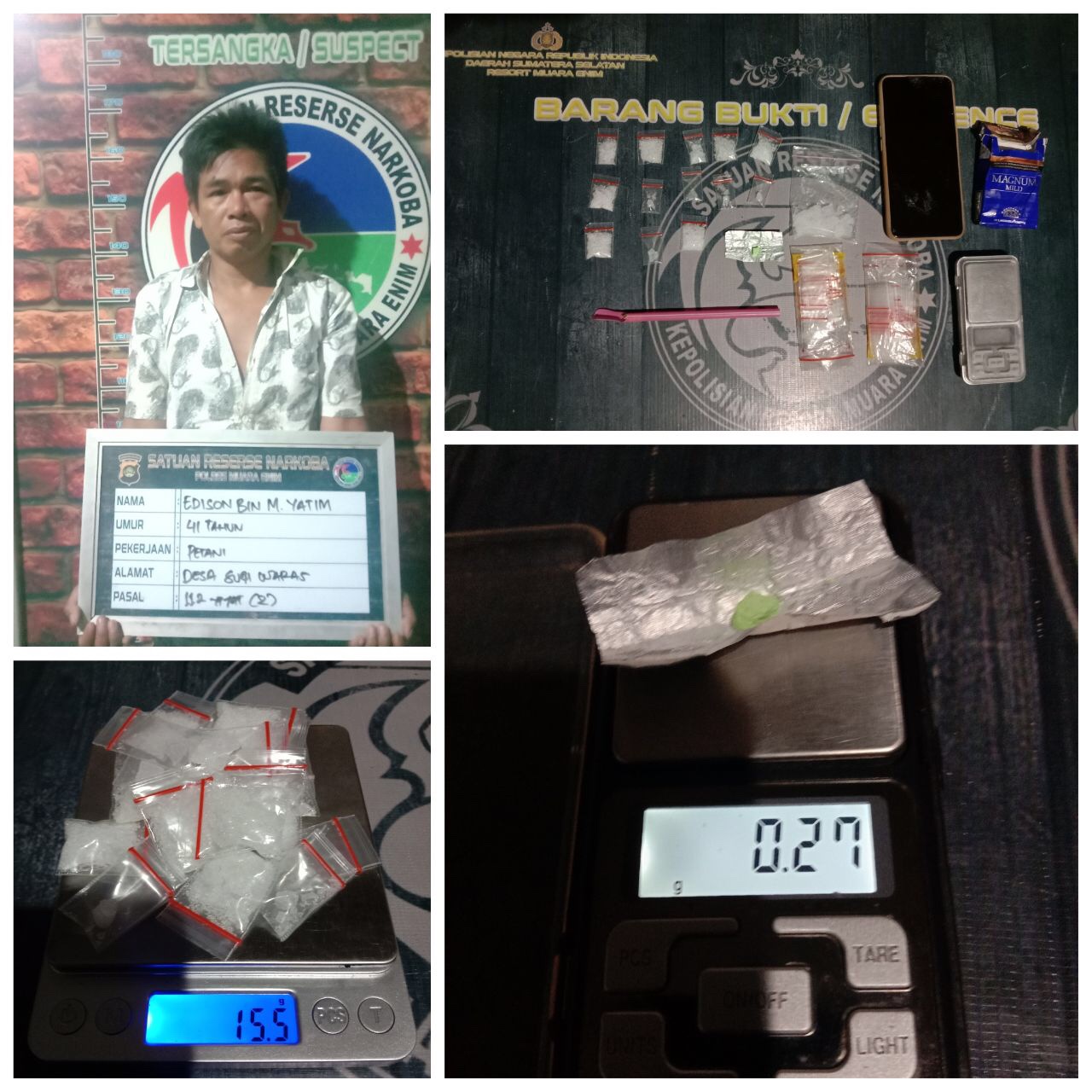 Pelaku yang diketahui bernama Edi Herson (41 ) yang berdomisili di Dusun V Desa Sugiwaras Kecamatan Rambang Kabupaten Muara Enim, ditangkap Kamis (14/01/2021) sekitar pukul 19.00 wib diamankan di Sat Resnarkoba Polres Muara Enim karena memiliki, menyimpan dan menguasai yang di duga narkotika jenis sabu.